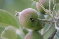 Pecking damage on Belle Fleur Rouge apple. This apple is too red early so gets pecked