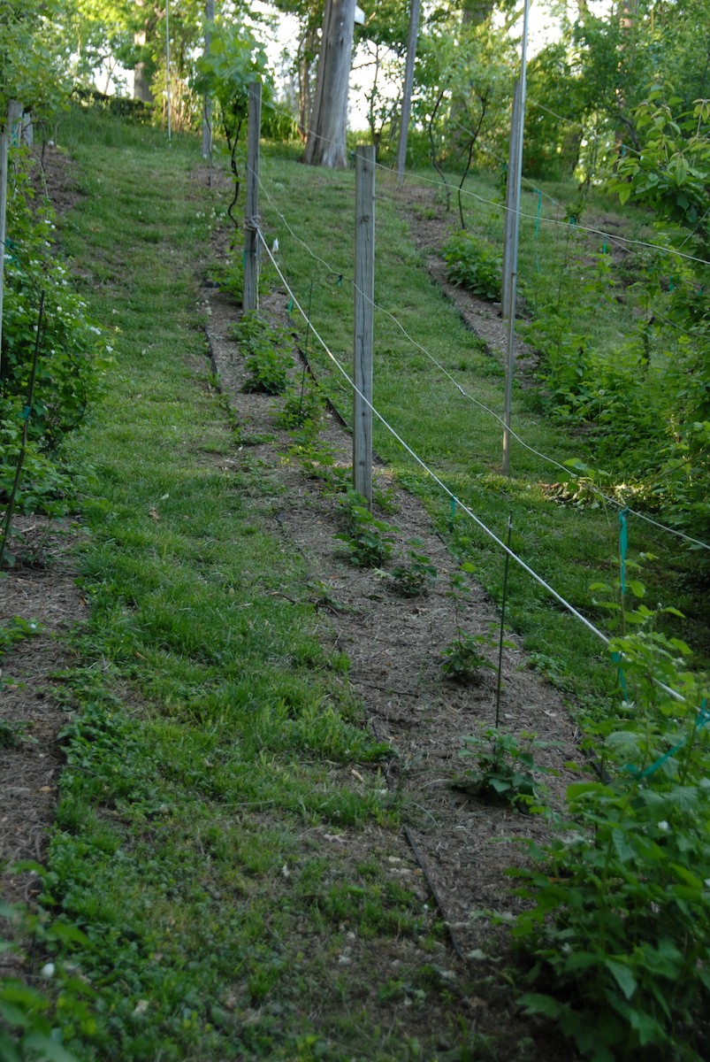 Caption: Blackberry row - notice weed fabric with mulch on top, avoids weed nightmare